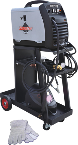 The Smarter Tools MIG-135 Welding Kit is the perfect choice to do projects and repairs around the home, farm and auto body shop. This MIG welder will produce a cleaner bead with less splatter than a regular flux core wire welder. The welder runs off of a standard 120 volt household outlet and produces an output range of 20-135 amps. It uses standard flux-core wire (E71-GS) or steel wire 0.6mm, 0.8mm in diameter and has 4 heat settings to easily adjust the output according to the thickness of metal you are welding. The welder can easily switch between gas-less flux-cored welding for deep penetration on thick steel or gas-shielded MIG welding on thin-gauge steel, stainless steel or aluminum. Package includes: MIG 135 welding power source, MIG torch with 8ft. (2.44m) lead, ground clamp with10ft. (3m) lead, 2 extra contact tips, a 1lb spool of flux wire, a 2lb spool of MIG wire, 0.6mm and 0.8mm (0.025 in. and 0.031 in.) drive roll, 0.9mm and 1.0mm (0.035 - 0.040 in.) drive roll, an adjustable gas regulator with a hose, ST-1S Auto-darkening welding helmet, gloves, users manual, and welding cart.